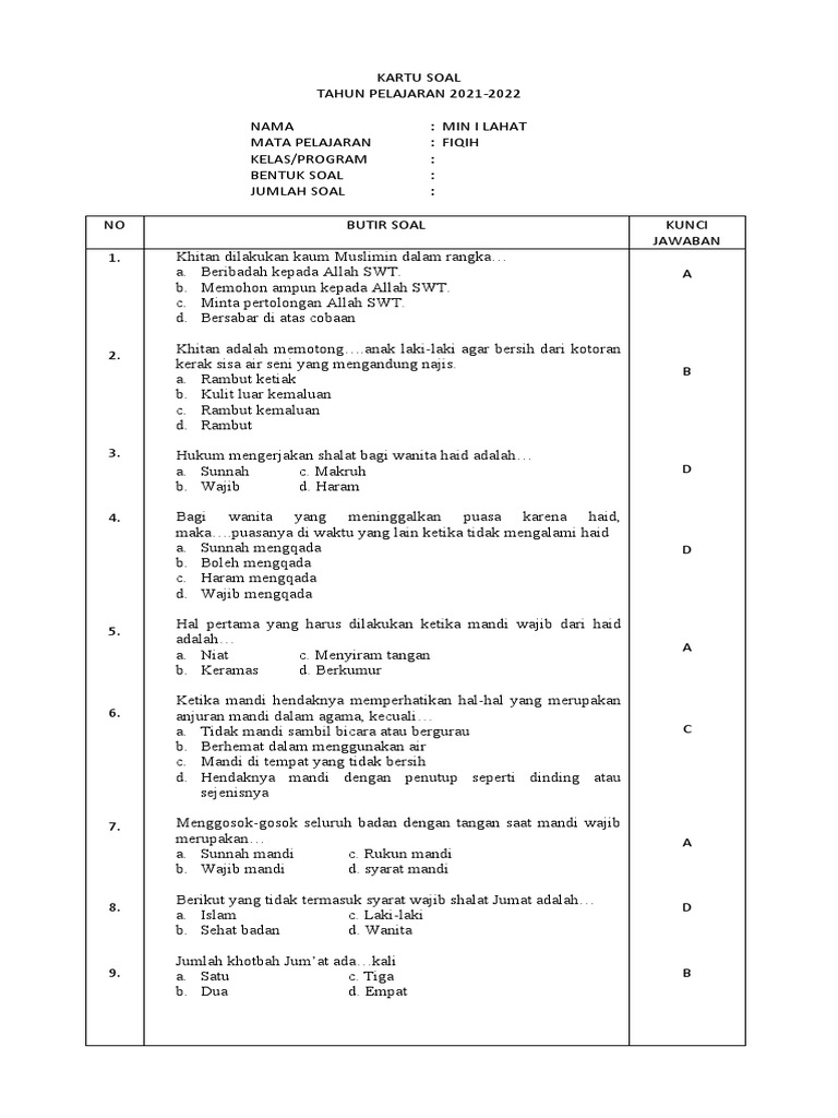 Memahami Fiqih dengan baik akan membantu kita menjalankan perintah Allah SWT dengan benar dan menjadi pribadi muslim yang taat. Untuk menghadapi USBN Fiqih, persiapan yang matang sangatlah penting. Salah satunya adalah dengan berlatih mengerjakan berbagai contoh soal. Artikel ini akan membahas materi-materi penting Fiqih kelas 9, dilengkapi dengan contoh-contoh soal pilihan ganda dan uraian beserta pembahasannya, serta tips sukses menghadapi USBN Fiqih.